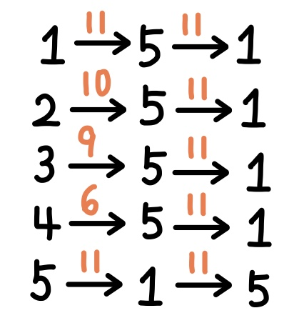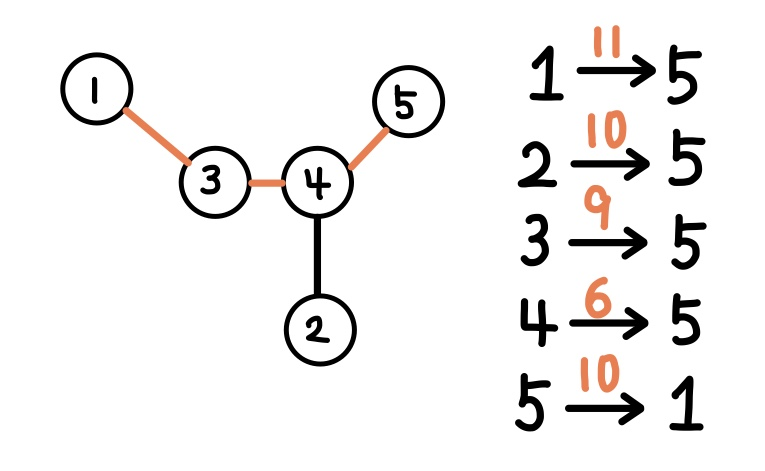 그렇기 때문에 모든 정점에서 부터의 최장 정점은 항상 가장 먼 정점인 1이나 5를 포함할 수 밖에 없다.