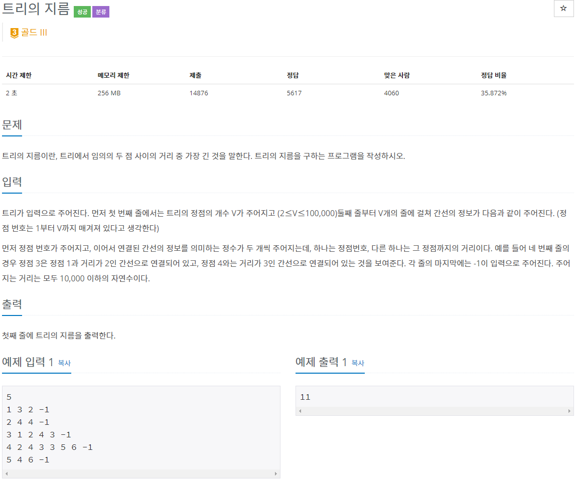 이때 트리에서 가장 먼 정점 사이의 거리는 1 <-> 5 인 11이다.