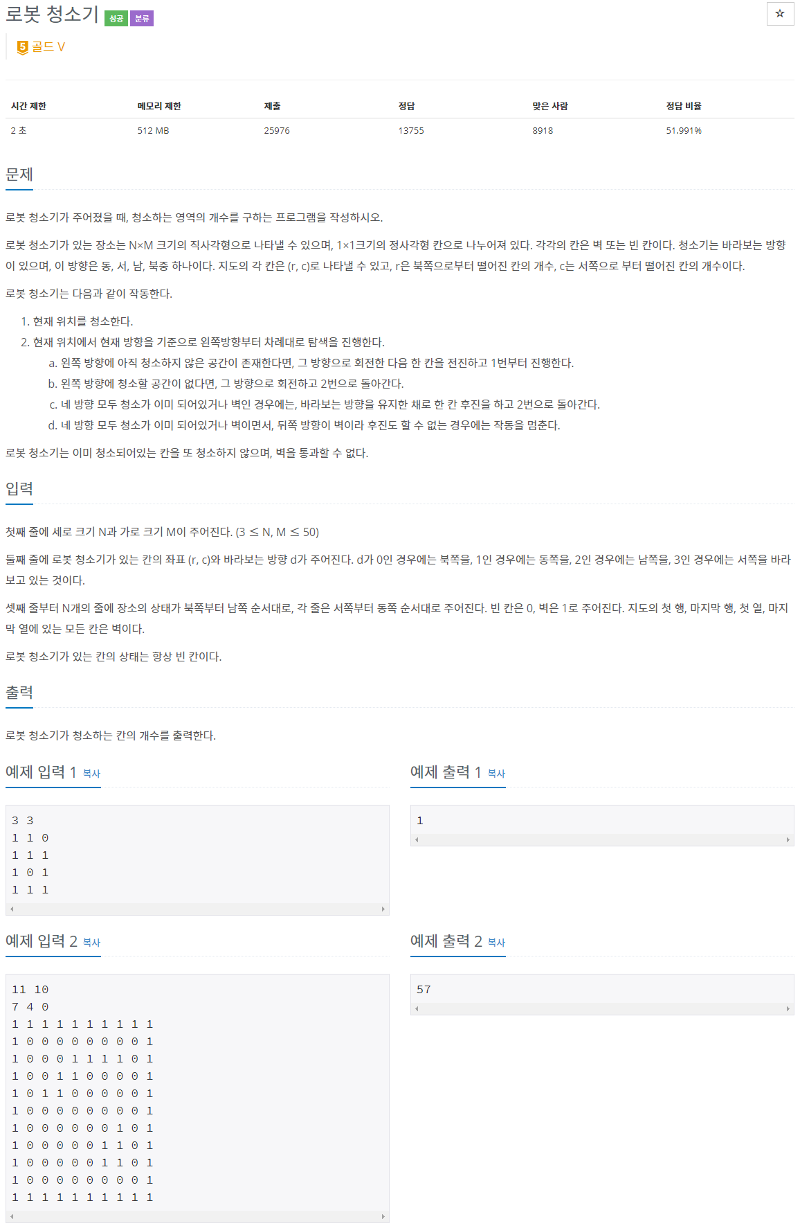 로봇 청소기가 주어졌을 때, 청소하는 영역의 개수를 구하는 프로그램을 작성하시오. 로봇 청소기가 있는 장소는 N×M 크기의 직사각형으로 나타낼 수 있으며, 1×1크기의 정사각형 칸으로 나누어