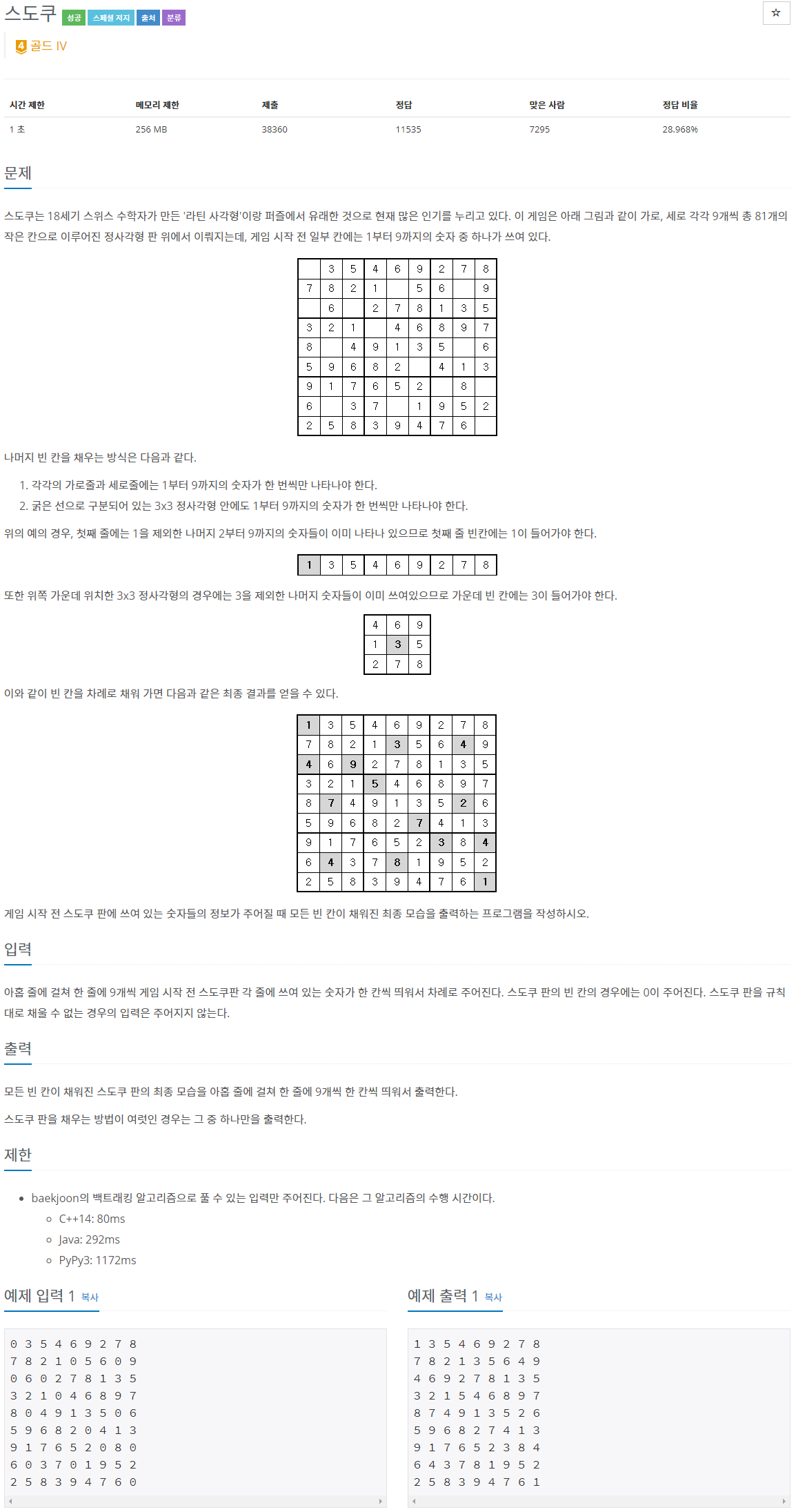 123456789101112131415161718192021222324252627282930313233343536373839404142434445464748495051525354555657585960616263646566676869707172import java.util.*;public class Main {static ArrayList<Node> list; //0이 있는 좌표를 저장한다.static int[][] board;public static void main(String[] args) {Scanner scan = new Scanner(System.in);list = new ArrayList<>();board = new int[9][9];for(int i = 0; i < 9; i++) {for(int j = 0; j < 9; j++) {board[i][j] = scan.nextInt();if(board[i][j] == 0) list.add(new Node(i, j));}}backtracking(0);}public static void backtracking(int idx) {if(idx == list.size()) {for(int i = 0; i < 9; i++) {for(int j = 0; j < 9; j++) {System.out.print(board[i][j] + " ");}System.out.println();}System.exit(0);}Node node = list.get(idx);for(int i = 1; i <= 9; i++) {if(check(node.x, node.y, i)) {board[node.x][node.y] = i;backtracking(idx + 1);board[node.x][node.y] = 0;}}}public static boolean check (int x, int y, int value) {//가로, 세로 검사for(int i = 0; i < 9; i++) {if(board[x][i] == value) return false;//가로줄에 value와 같은 값이 있다면 falseif(board[i][y] == value) return false;//세로줄에 value와 같은 값이 있다면 false}//9칸 검사int nx = x / 3 * 3; //9칸의 시작x 좌표를 구함int ny = y / 3 * 3; //9칸의 시작y좌표를 구함for(int i = nx; i < nx + 3; i++) {for(int j = ny; j < ny + 3; j++) {if(board[i][j] == value) return false;}}return true;}public static class Node {int x;int y;public Node(int x, int y) {this.x = x;this.y = y;}}}cs '문제풀이 > 백준' 카테고리의 다른 글