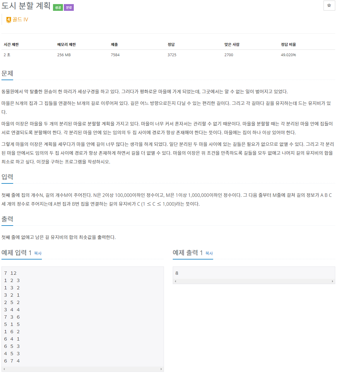 이 문제의 어려웠던 점은 하나로 연결된 집을 간선의 비용을 최소로 갖는 두 개의 마을로 나누는 부분이다. 처음에는 어떻게 해야 하나 감이 안잡혔지만 생각해 보니 굉장히 쉬운 문제였다.