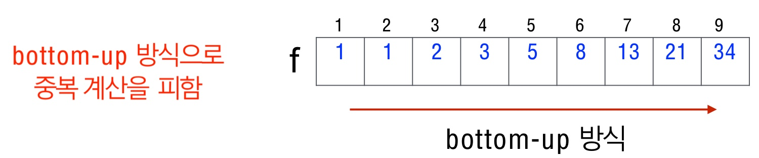 int[] fibo = new int[n + 1]; fibo[0] = 0; fibo[1] = 1; for(int i = 2; i <= n; i++) { fibo[i] = fibo[i - 1] + fibo[i - 2]; } return fibo[n];- 동적 계획법이라고도 하며, bottom-up 방식으로 n번만큼 반복하게 된다. 이전에 계산한 값을 가지고 계산을 축적해 나가므로 이미 계산한 값을 다시 계산하는 과정이 발생하지 않는다.