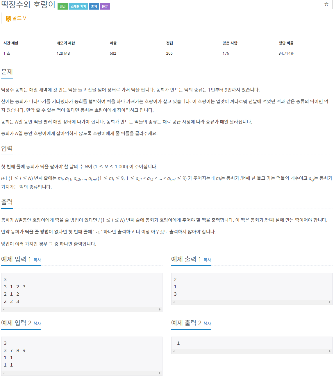 12345678910111213141516171819202122232425262728293031323334353637383940414243444546import java.util.*;public class Main {static ArrayList<Integer>[] list;static boolean[][] visited;static int[] result;public static void main(String[] args) {Scanner scan = new Scanner(System.in);int n = scan.nextInt();list = new ArrayList[n + 1];for(int i = 1; i < n + 1; i++) {list[i] = new ArrayList<>();int m = scan.nextInt();for(int j = 0; j < m; j++) {list[i].add(scan.nextInt());}}result = new int[n + 1];visited = new boolean[n + 2][10]; //[n번째 날][떡의 종류]dfs(1, 0, n);System.out.println("-1");}public static void dfs(int idx, int prev, int n) {if(idx == n + 1) {for(int i = 1; i < n + 1; i++) {System.out.println(result[i]);}System.exit(0);}for(int i = 1; i < 10; i++) {if(i != prev && visited[idx + 1][i] == false && list[idx].contains((Integer)i)) {visited[idx + 1][i] = true;result[idx] = i;dfs(idx + 1, i, n);}}}}cs '문제풀이 > 백준' 카테고리의 다른 글