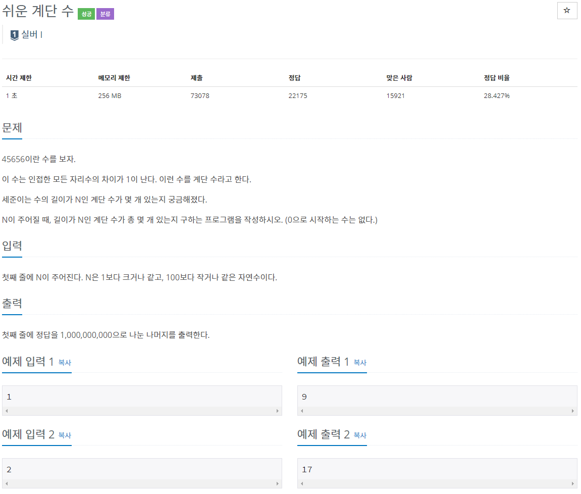 12345678910111213141516171819202122232425262728293031import java.util.*;public class Main {static long mod = 1000000000;public static void main(String[] args) {Scanner scan = new Scanner(System.in);int n = scan.nextInt();long[][] dp = new long[n + 1][10];for(int i = 1; i <= 9; i++) {dp[1][i] = 1; //1자리 수의 i번째 수가 계단이 되는 경우는 한가지 밖에 없으므로 초기화.}for(int i = 2; i <= n; i++) {for(int j = 0; j < 10; j++) {if(j == 0) dp[i][j] = dp[i - 1][j + 1] % mod; //끝 자리가 0일때는 앞에 올 수 있는 수가 1밖에 없다.else if(j == 9) dp[i][j] = dp[i - 1][j - 1] % mod; //끝 자리가 9 일때는 앞에 올 수 있는 수가 8밖에 없다.else dp[i][j] = (dp[i - 1][j - 1] + dp[i - 1][j + 1]) % mod;}}long result = 0;for(int i = 0; i < 10; i++ ) {result += dp[n][i];}System.out.println(result % mod);}}cs '문제풀이 > 백준' 카테고리의 다른 글