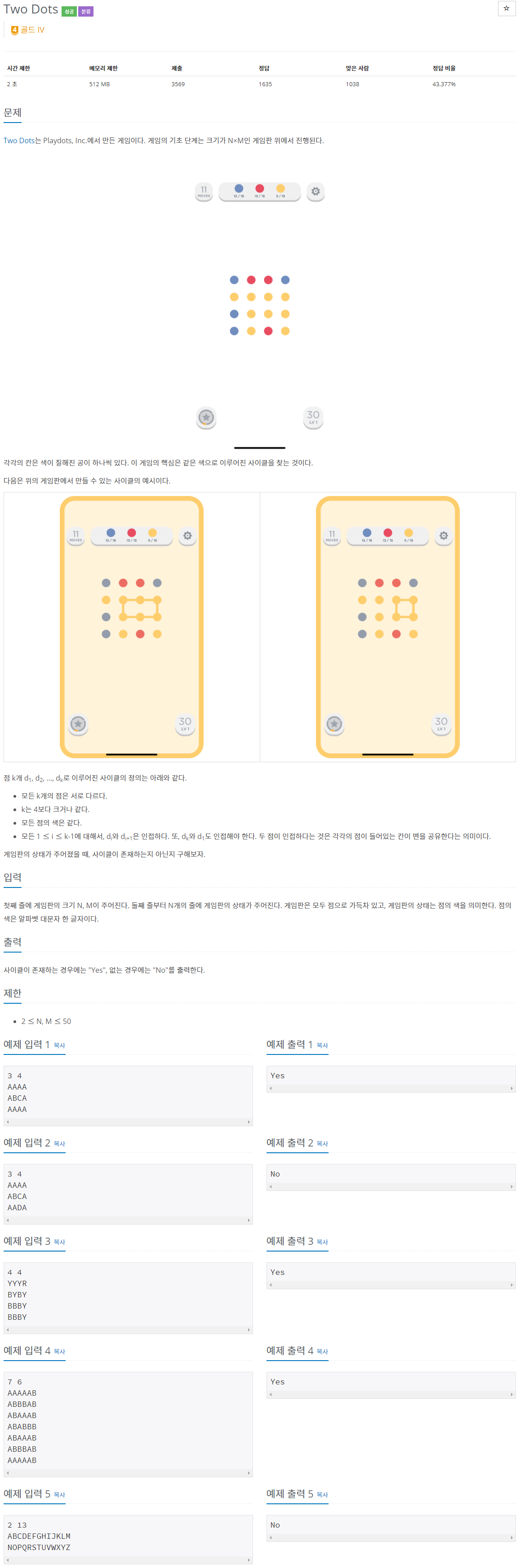 해당 게임을 알고 있다면 아주 쉽게 이해할 수 있다. 싸이클을 이루는 같은 색의 점 4개를 선택할 수 있는지 출력하는 문제이다.