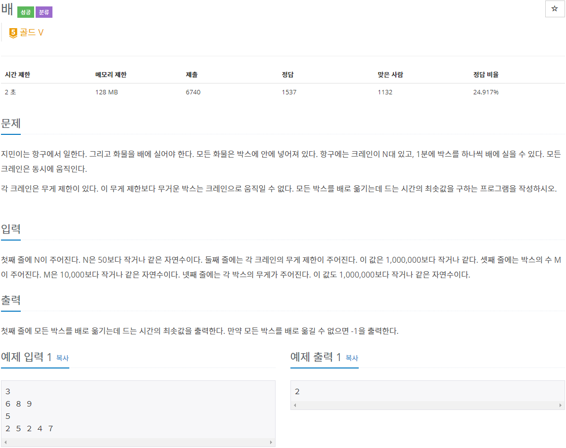 만약 제일 무거운 박스가 크레인의 무게 제한으로 인해 어떤 크레인으로도 박스를 옮길 수 없다면 -1을 출력해 주었다.