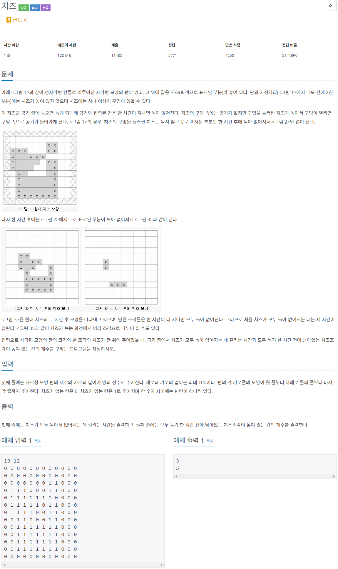 123456789101112131415161718192021222324252627282930313233343536373839404142434445464748495051525354555657585960616263import java.util.*;public class Main {static int[] dx = {0, 1, 0, -1};static int[] dy = {1, 0, -1, 0};static boolean[][] visited;static int[][] board;static int n, m;static int cheese;public static void main(String[] args) {Scanner scan = new Scanner(System.in);n = scan.nextInt();m = scan.nextInt();board = new int[n][m];cheese = 0;for(int i = 0; i < n; i++) {for(int j = 0; j < m; j++) {board[i][j] = scan.nextInt();if(board[i][j] == 1) cheese++;}}int cheeseCount = 0;int time = 0;while(cheese != 0) {cheeseCount = cheese;time++;visited = new boolean[n][m];bfs();}System.out.println(time);System.out.println(cheeseCount);}public static void bfs() {Queue<int[]> q = new LinkedList<>();q.offer(new int[] {0, 0});visited[0][0] = true;while(!q.isEmpty()) {int[] current = q.poll();for(int i = 0; i < 4; i++) {int nx = current[0] + dx[i];int ny = current[1] + dy[i];if(nx >= 0 && ny >= 0 && nx < n && ny < m && visited[nx][ny] == false) {visited[nx][ny] = true;if(board[nx][ny] == 0) {q.offer(new int[] {nx, ny});} else {cheese--;board[nx][ny] = 0;}}}}}}cs '문제풀이 > 백준' 카테고리의 다른 글