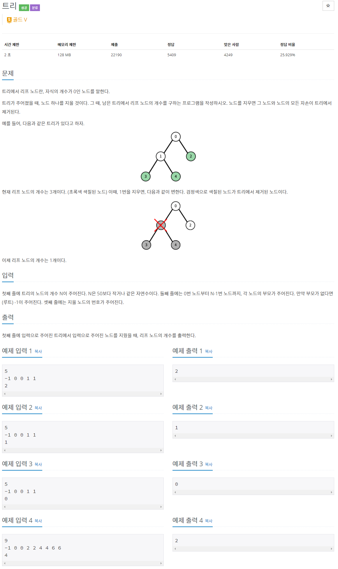 부모 인덱스를 입력받고, 노드를 삭제한 후 리프 노드를 count하는 문제로 깊이 우선 탐색 방법을 적용하여 문제를 풀었다. (약간 변형된 DFS문제라고 생각한다.)