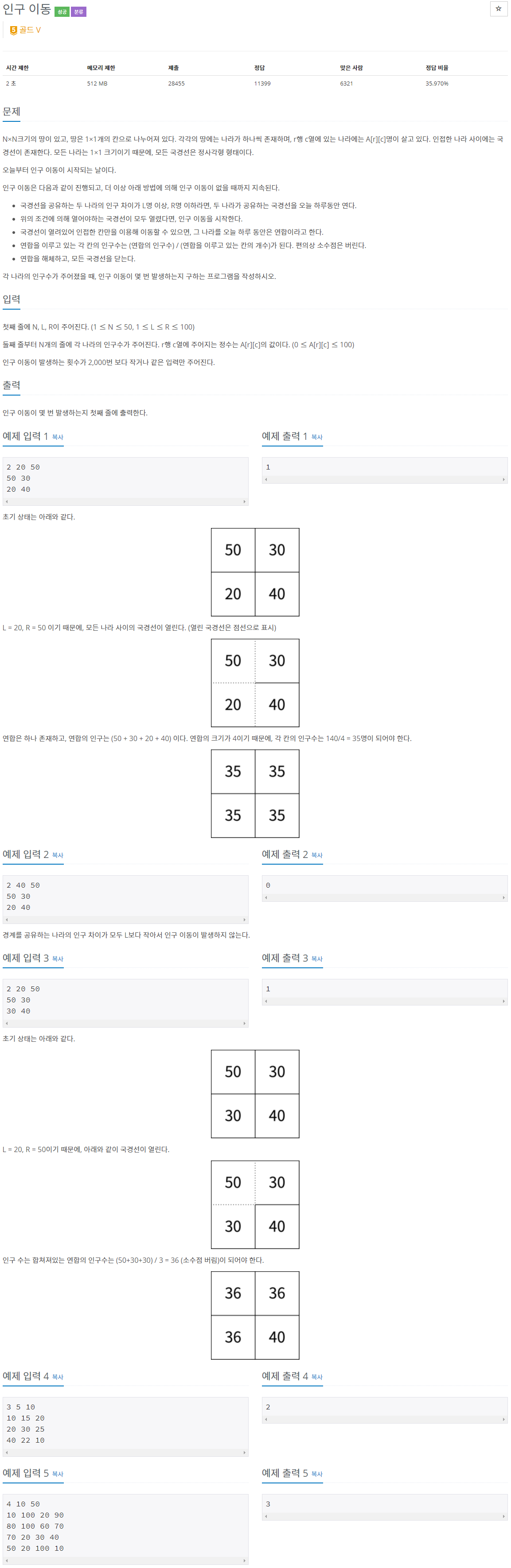 1234567891011121314151617181920212223242526272829303132333435363738394041424344454647484950515253545556575859606162636465666768697071727374757677787980818283848586878889909192939495import java.util.*;public class Main {static int n, l, r;static int[][] board;static boolean[][] visited;static int[] dx = {0, 1, 0, -1};static int[] dy = {1, 0, -1, 0};static ArrayList<Node> list; //인구 이동이 필요한 노드 리스트public static void main(String[] args) {Scanner scan = new Scanner(System.in);n = scan.nextInt();l = scan.nextInt();r = scan.nextInt();board = new int[n][n];for(int i = 0; i < n; i++) {for(int j = 0; j < n; j++) {board[i][j] = scan.nextInt();}}System.out.println(move());}public static int move() { //더 이상 인구이동이 일어나지 않을 때까지 반복int result = 0;while(true) {boolean isMove = false;visited = new boolean[n][n];for(int i = 0; i < n; i++) {for(int j = 0; j < n; j++) {if(!visited[i][j]) {int sum = bfs(i, j); //bfs탐색으로 열릴 수 있는 국경선 확인 하며 인구 이동할 총 인구수 반환if(list.size() > 1) {changePopulation(sum); //열린 국경선 내의 노드들 인구 변경isMove = true;}}}}if(!isMove) return result;;result++;}}public static int bfs(int x, int y) {Queue<Node> q = new LinkedList<>();list = new ArrayList<>();q.offer(new Node(x, y));list.add(new Node(x, y));visited[x][y] = true;int sum = board[x][y];while(!q.isEmpty()) {Node current = q.poll();for(int i = 0; i < 4; i++) {int nx = current.x + dx[i];int ny = current.y + dy[i];if(nx >= 0 && ny >= 0 && nx < n && ny < n && !visited[nx][ny]) {int diff = Math.abs(board[current.x][current.y] - board[nx][ny]);if(l <= diff && diff <= r) {q.offer(new Node(nx, ny));list.add(new Node(nx, ny));sum += board[nx][ny];visited[nx][ny] = true;}}}}return sum;}public static void changePopulation(int sum) {int avg = sum / list.size();for(Node n : list) {board[n.x][n.y] = avg;}}public static class Node {int x;int y;public Node(int x, int y) {this.x = x;this.y = y;}}}cs '문제풀이 > 백준' 카테고리의 다른 글