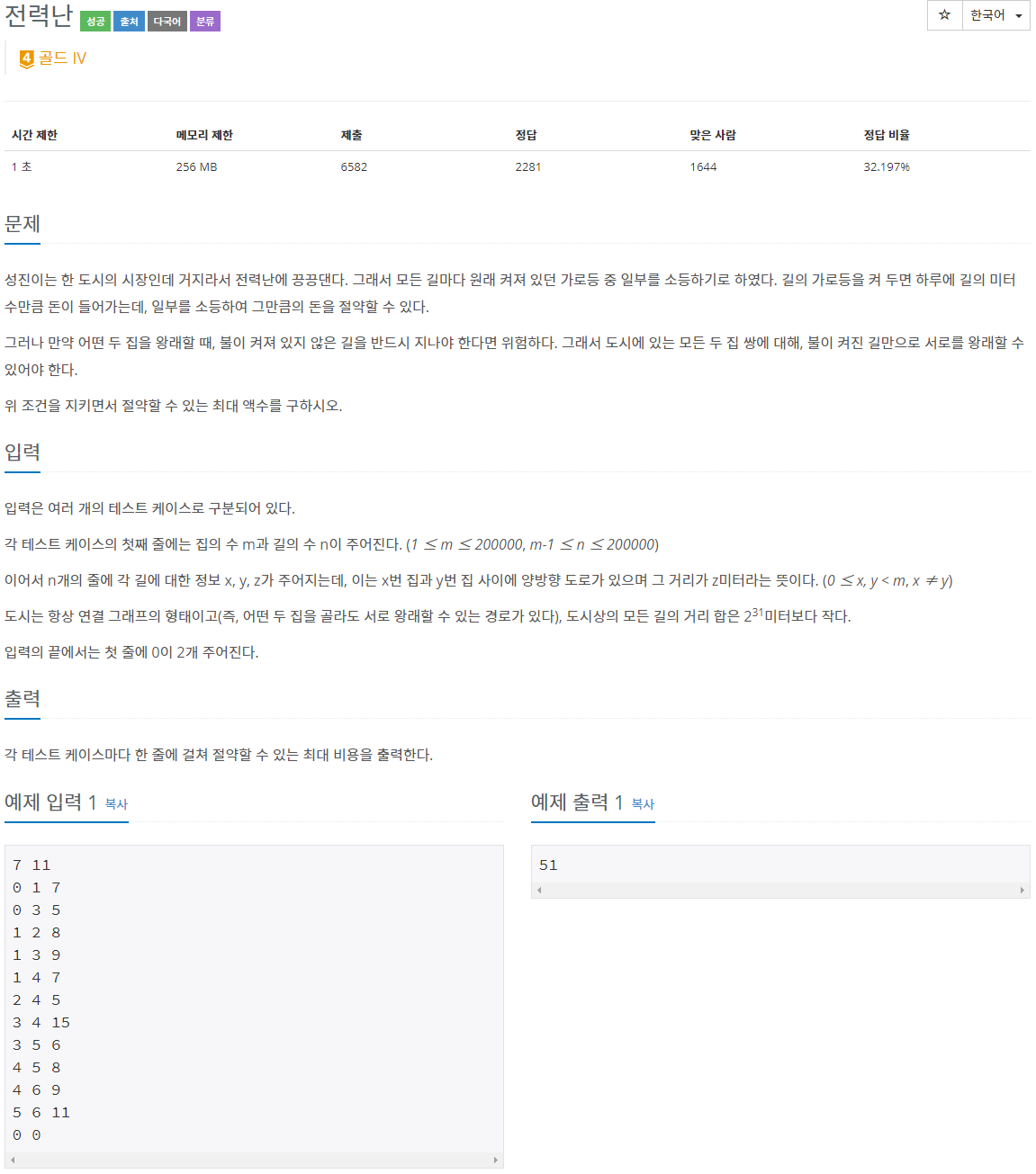 문제를 읽어보면 결국 최소 비용을 가질 수 있는 불이 켜진 길로만 이동할때 절약할 수 있는 최대 비용을 찾는것이다. 즉, 전체 비용에서 최소비용을 뺀 값이 우리가 구하려고 하는 값이 된다. 그러므로 prim이나 kruskal알고리즘을 사용하여 MST를 구하고, 이를 전체 비용해서 빼 주면 되는 간단한 문제이다.