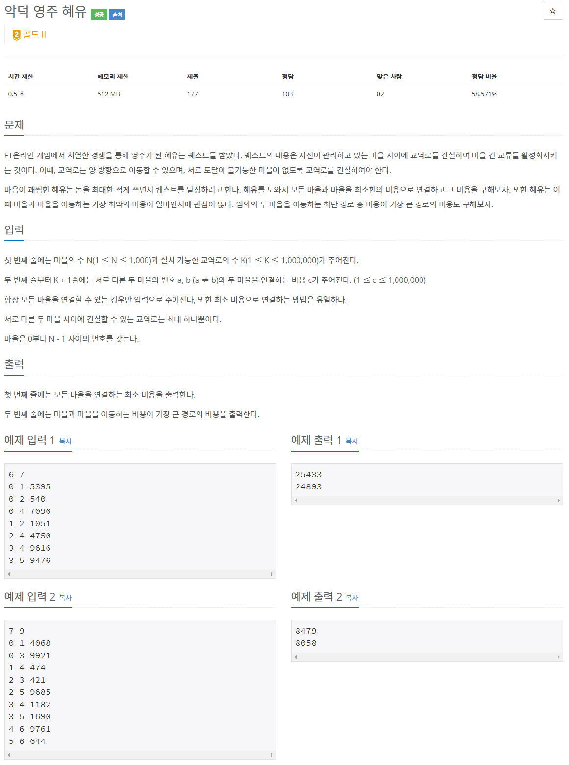 - 마을 간 교역로 정보를 입력 받은 후 MST를 구한다.