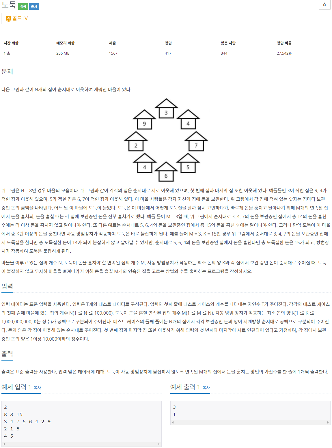 - N개의 집들 중에서 M개의 연속된 집을 선택하여 K이하의 돈을 훔칠 수 있는 경우의 수를 구하는 문제이다.