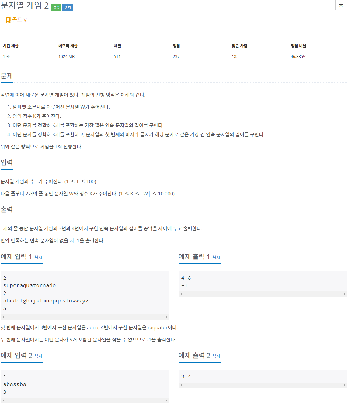 - 소문자로 이루어진 문자열에서 어떤 문자를 K개 포함하는 가장 짧은, 가장 긴 문자열의 길이를 구한다.
