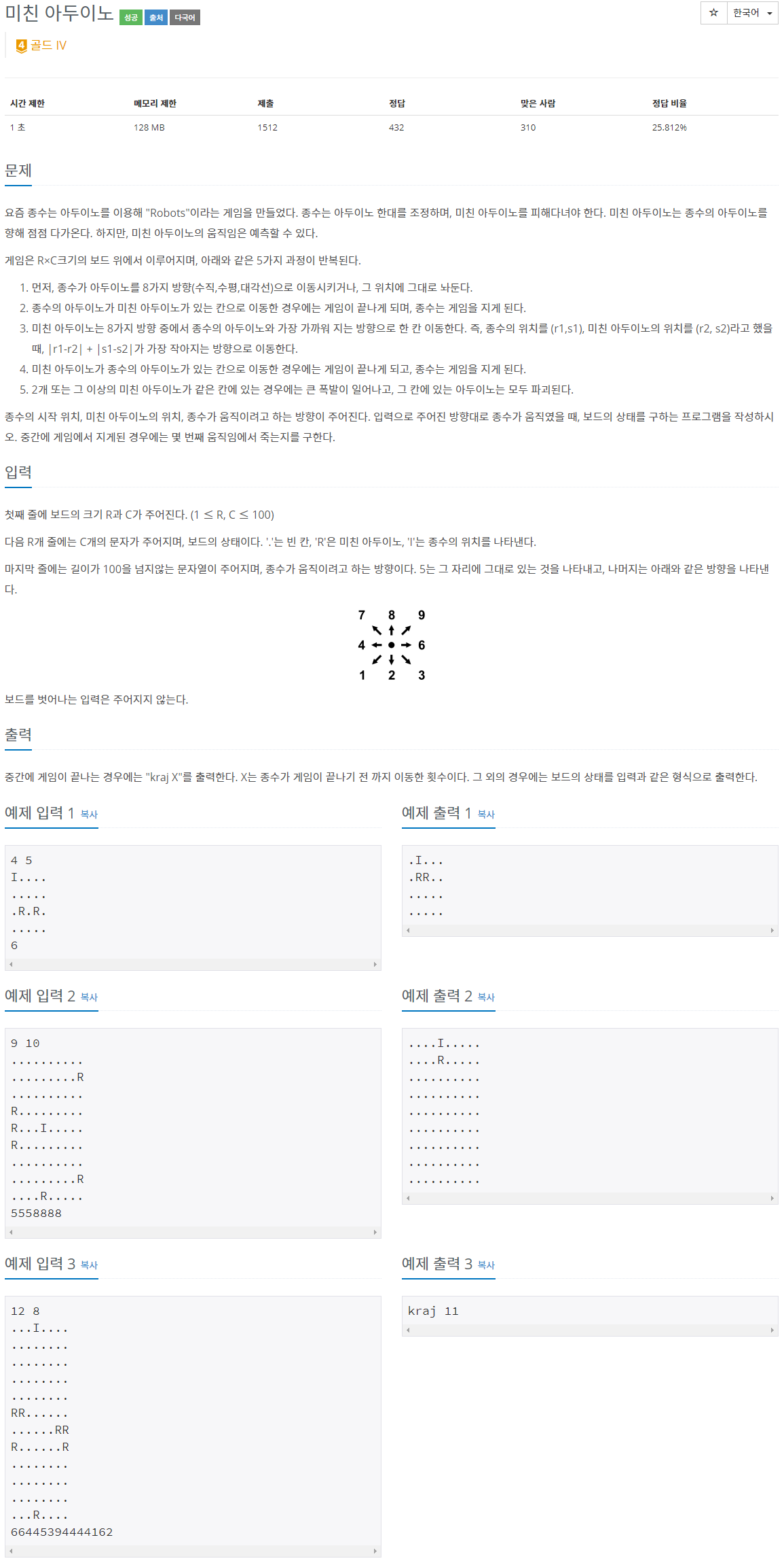 123456789101112131415161718192021222324252627282930313233343536373839404142434445464748495051525354555657585960616263646566676869707172737475767778798081828384858687888990919293949596979899100101102103104105106107108109110111112113114115116117118119120121122123124125126//8972: 미친 아두이노import java.io.*;import java.util.*;public class Main {static int r, c;static char[][] board;static int[] dx = {0, 1, 1, 1, 0, 0, 0, -1, -1, -1};static int[] dy = {0, -1, 0, 1, -1, 0, 1, -1, 0, 1};static LinkedList<Node> craze_arduino;static Node arduino;public static void main(String[] args) throws IOException {//입력BufferedReader bf = new BufferedReader(new InputStreamReader(System.in));String str = bf.readLine();StringTokenizer st = new StringTokenizer(str);r = Integer.parseInt(st.nextToken());c = Integer.parseInt(st.nextToken());board = new char[r][c];craze_arduino = new LinkedList<>(); //미친 아두이노의 위치 저장for(int i = 0; i < r; i++) {str = bf.readLine();for(int j = 0; j < c; j++) {board[i][j] = str.charAt(j);if(board[i][j] == 'R') craze_arduino.add(new Node(i, j));else if(board[i][j] == 'I') arduino = new Node(i, j);}}String direction = bf.readLine();//입력 끝int count = 1; //움직인 횟수boolean is_lose = false;for(int k = 0; k < direction.length(); k++){//종수 아두이노 이동board[arduino.x][arduino.y] = '.';arduino.x = arduino.x + dx[direction.charAt(count - 1) - '0'];arduino.y = arduino.y + dy[direction.charAt(count - 1) - '0'];if(board[arduino.x][arduino.y] == 'R') {is_lose = true;break;}board[arduino.x][arduino.y] = 'I';//미친 아두이노 이동if(!move_craze_arduino()) {is_lose = true;break;}count++;}if(is_lose) System.out.println("kraj " + count);else print_board();}public static boolean move_craze_arduino() {int[][] arduino_count = new int[r][c];int craze_arduino_size = craze_arduino.size();for(int i = 0; i < craze_arduino_size; i++) {Node current = craze_arduino.poll();board[current.x][current.y] = '.';int dir = find_close_dir(current);int nx = current.x + dx[dir];int ny = current.y + dy[dir];if(board[nx][ny] == 'I') return false;arduino_count[nx][ny]++;}for(int i = 0; i < r; i++) {for(int j = 0; j < c; j++) {if(arduino_count[i][j] == 1) {board[i][j] = 'R';craze_arduino.add(new Node(i, j));}}}return true;}public static int find_close_dir(Node current) {int min = Integer.MAX_VALUE;int min_dir = -1;for(int i = 1; i <= 9; i++) {if(i == 5) continue; //미친 아두이노는 가만히 있는 경우가 없다.int nx = current.x + dx[i];int ny = current.y + dy[i];if(nx < 0 || ny < 0 || nx >= r || ny >= c) continue;int distance = Math.abs(nx - arduino.x) + Math.abs(ny - arduino.y);if(min > distance) {min = distance;min_dir = i;}}return min_dir;}public static void print_board() {for(int i = 0; i < r; i++) {for(int j = 0; j < c; j++) {System.out.print(board[i][j]);}System.out.println();}}public static class Node {int x, y;public Node(int x, int y) {this.x = x;this.y = y;}}}cs '문제풀이 > 백준' 카테고리의 다른 글