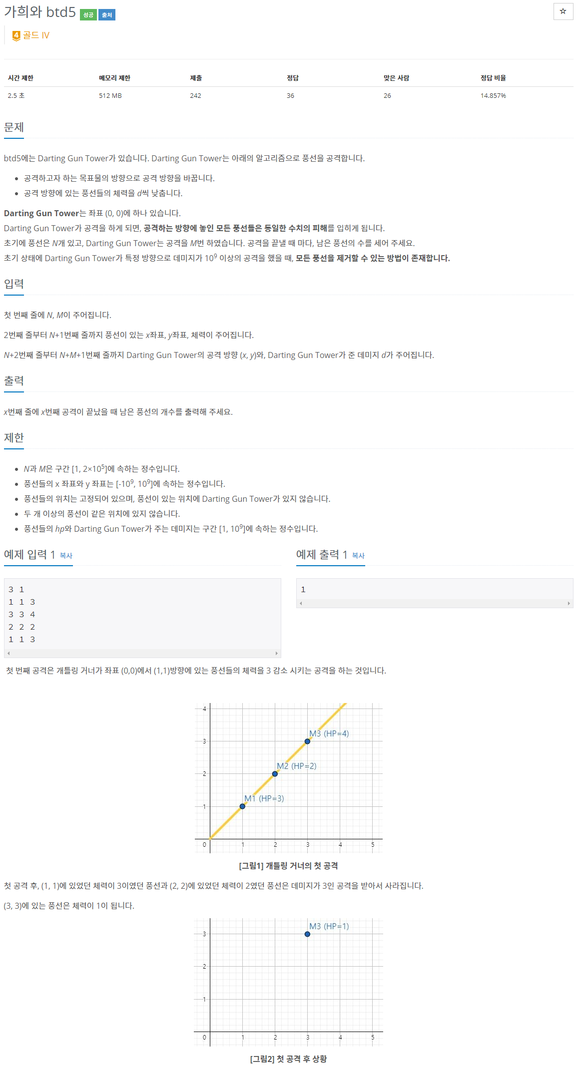 - 이 문제가 시간 복잡도가 조금 빠듯하게 설정되어 있는듯 하다. 타워의 정보를 모두 입력 받고 난 다음에 공격을 하면 시간 초과가 발생한다. 입력을 받으면서 공격을 하니까 시간초과가 발생하지 않았다.