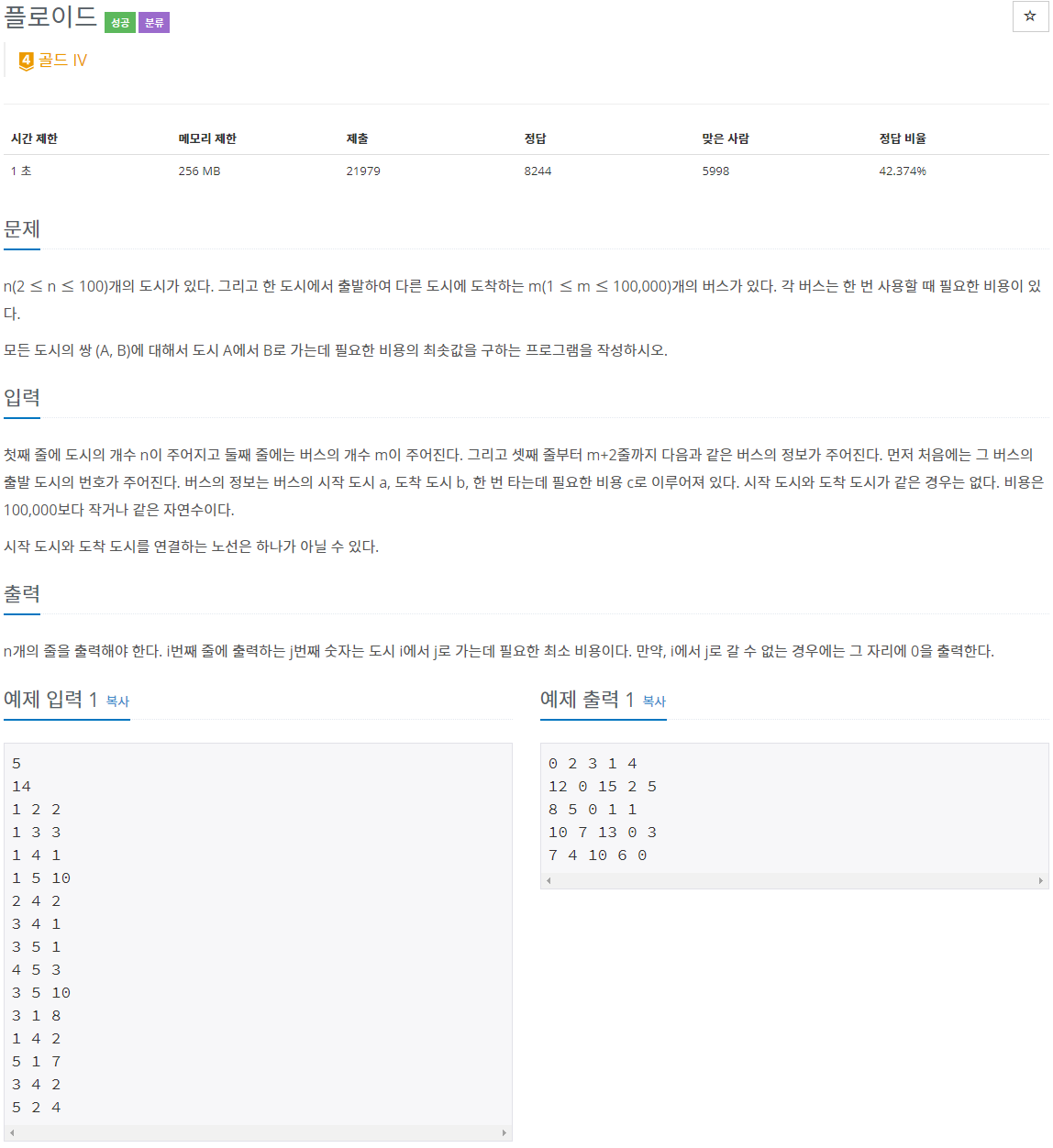 문제를 꼭 제대로 읽자! 출력 설명에 i에서 j로 가는 길이 없으면 0을 출력한다고 되어있다. 이를 체크 안해주면 98프로에서 틀린다. 꼭꼭 문제를 제대로 읽자.