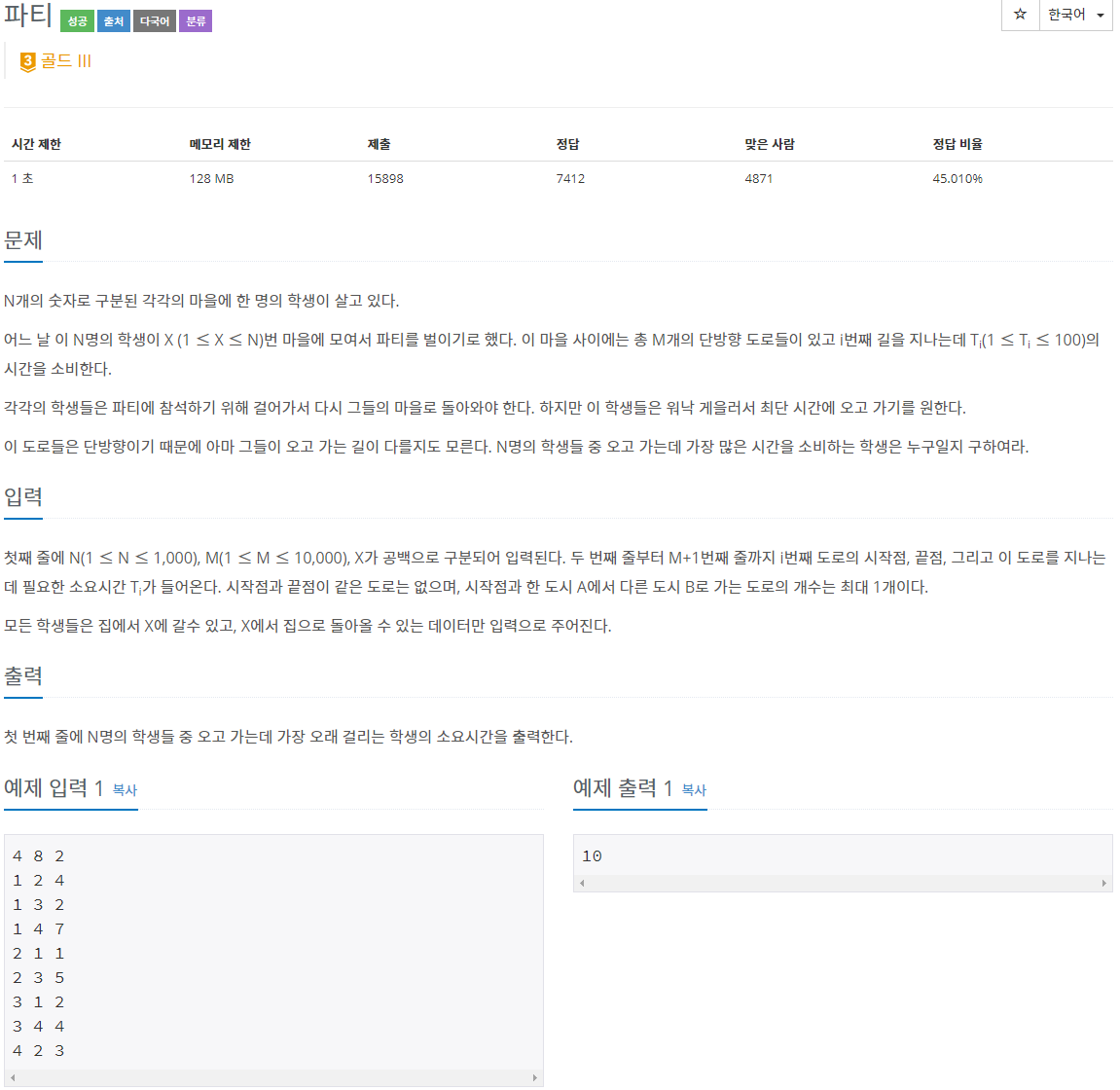 첫째 줄에 N(1 ≤ N ≤ 1,000), M(1 ≤ M ≤ 10,000), X가 공백으로 구분되어 입력된다. 두 번째 줄부터 M+1번째 줄까지 i번째 도로의 시작점, 끝점, 그리고 이 도로를 지나는데 필요한 소요시간 Ti가 들어
