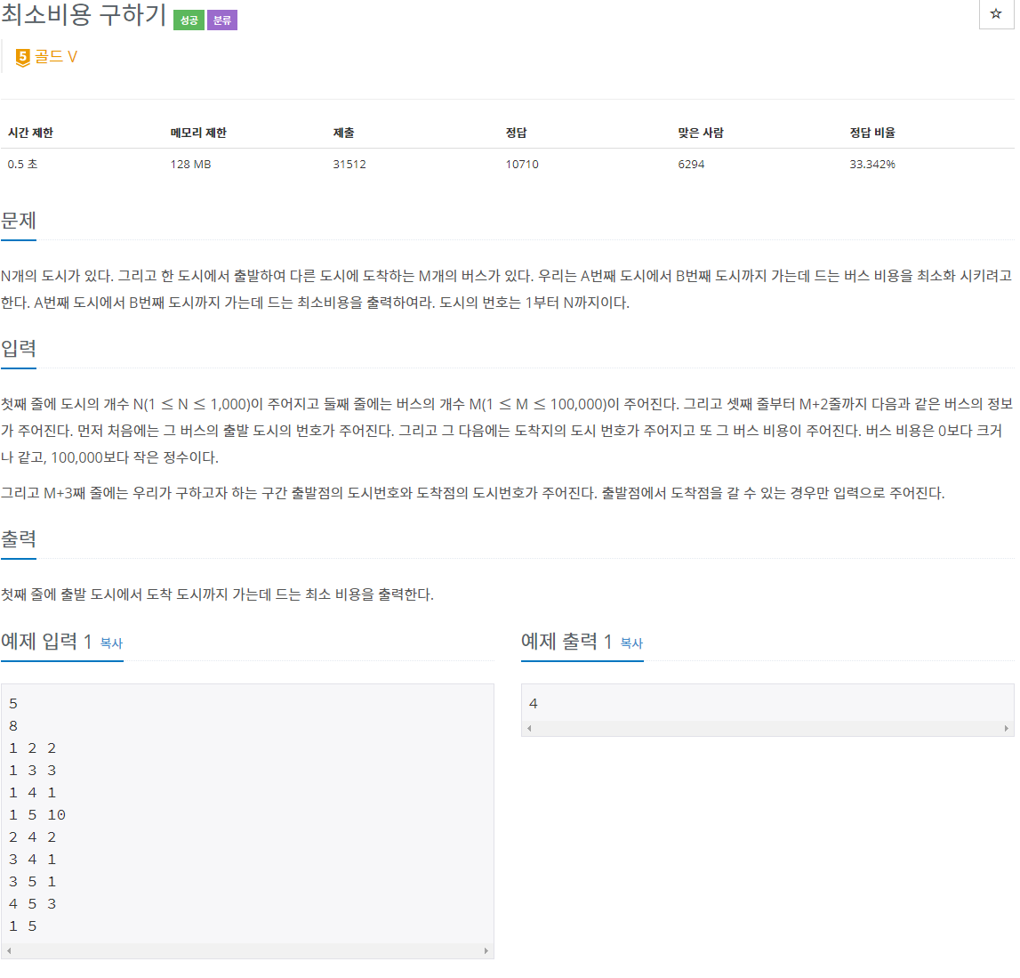 123456789101112131415161718192021222324252627282930313233343536373839404142434445464748495051525354555657585960616263646566import java.util.*;public class Main {static int[][] node;static int[][] bus;static int n, m, start, end;static int[] dist;public static void main(String[] args) {Scanner scan = new Scanner(System.in);n = scan.nextInt();node = new int[n + 1][n + 1];m = scan.nextInt();bus = new int[m][3];for(int i = 0; i < m; i++) {bus[i][0] = scan.nextInt();bus[i][1] = scan.nextInt();bus[i][2] = scan.nextInt();}start = scan.nextInt(); //시작노드end = scan.nextInt(); //도착노드dist = new int[n + 1]; //start로부터 각 노드까지 최단거리 계산//값 초기화for(int i = 1; i <= n; i++) {dist[i] = 1000000001; //최대 도시의 개수 1000 * 간선의 최대 비용 1000000 + 1 값이 최대값이 된다.for(int j = 1; j <= n; j++) {node[i][j] = 1000000001;}}for(int i = 0; i < m; i++) {int x = bus[i][0];int y = bus[i][1];int value = bus[i][2];if(node[x][y] > value) { //더 작은 가중치 값으로 갱신node[x][y] = value;}}dijkstra();System.out.println(dist[end]);}public static void dijkstra() {PriorityQueue<Integer> q = new PriorityQueue<>(); //최소 힙 사용하여 구현q.offer(start);dist[start] = 0;while(!q.isEmpty()) {int current = q.poll();for(int i = 1; i <= n; i++) {//자기 자신으로 가는 경우를 제외하고, 현재 노드에서 i로 가는 가중치가 더 작은 값이 있다면 갱신해 준다.if(i != current && dist[i] > dist[current] + node[current][i]) {dist[i] = dist[current] + node[current][i];q.offer(i); //해당 노드를 우선순위 큐에 담아서 더 작은 값부터 탐색하도록 한다.}}}}}cs '문제풀이 > 백준' 카테고리의 다른 글