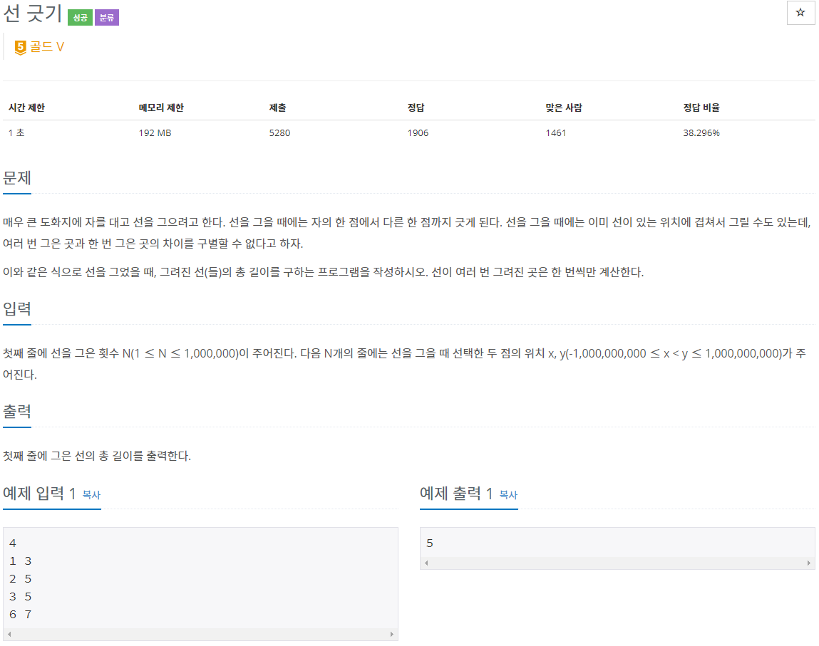 123456789101112131415161718192021222324252627282930313233343536373839404142434445import java.io.*;import java.util.*;public class Main {public static void main(String[] args) throws NumberFormatException, IOException {BufferedReader br = new BufferedReader(new InputStreamReader(System.in));int n = Integer.parseInt(br.readLine());int[][] pos = new int[n][2];int result=0;for (int i = 0; i < n; i++) {String line = br.readLine();int p1 = Integer.parseInt(line.split(" ")[0]);int p2 = Integer.parseInt(line.split(" ")[1]);pos[i][0] = p1;pos[i][1] = p2;}Arrays.sort(pos, new Comparator<int[]>() { //x좌표 오름차순 정렬. x좌표 같으면 y좌표 오름차순 정렬@Overridepublic int compare(int[] o1, int[] o2) {if(o1[0] == o2[0]) return o1[1] - o2[1];else return o1[0] - o2[0];}});int min = pos[0][0];//이전 선의 x좌표int max = pos[0][1];//이전 선의 y좌표int len = max - min;for(int i = 1; i < n; i++) {if(min <= pos[i][0] && pos[i][1] <= max) { //현재 선이 이전 선에 포함된다면continue;} else if(pos[i][0] < max) { //현재 선의 시작점이 이전 선에 포함된다면len += pos[i][1] - max;} else { //현재 선과 이전 선이 겹치지 않는다면len += pos[i][1] - pos[i][0];}min = pos[i][0];max = pos[i][1];}System.out.println(len);}}cs '문제풀이 > 백준' 카테고리의 다른 글