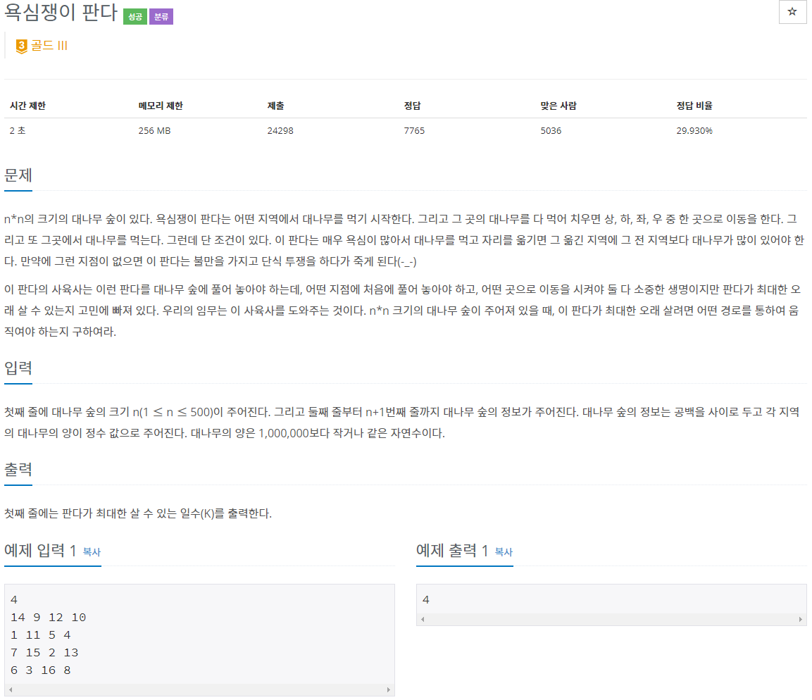 n*n의 크기의 대나무 숲이 있다. 욕심쟁이 판다는 어떤 지역에서 대나무를 먹기 시작한다. 그리고 그 곳의 대나무를 다 먹어 치우면 상, 하, 좌, 우 중 한 곳으로 이동을 한다. 그리고 또 그곳에서