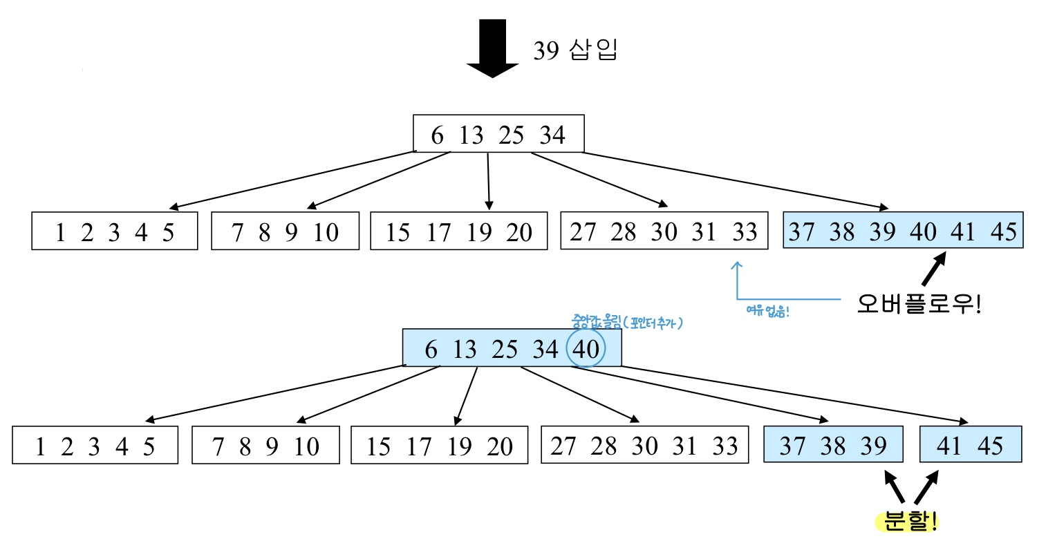 - 없으면 오버플로가 발생한 레코드를 둘로 분할하고 가운데 키를 부모 노드로 넘긴다.