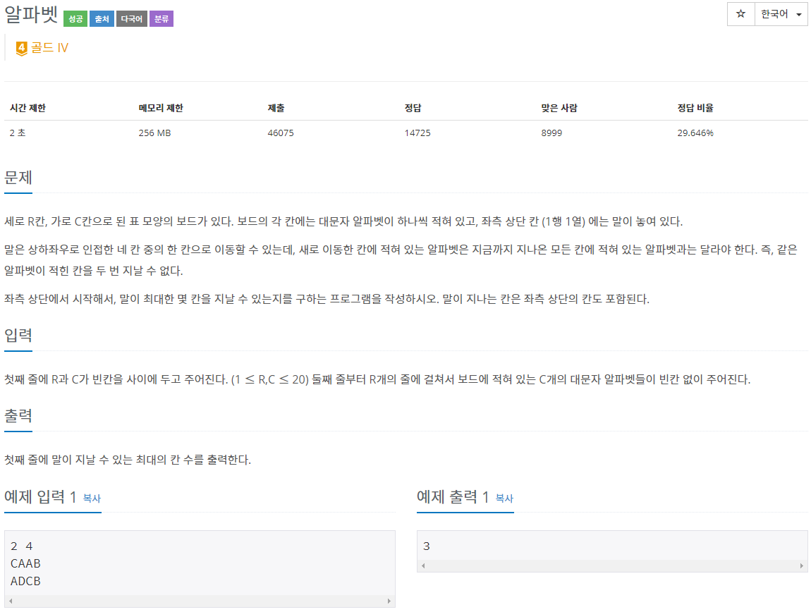 세로 R칸, 가로 C칸으로 된 표 모양의 보드가 있다. 보드의 각 칸에는 대문자 알파벳이 하나씩 적혀 있고, 좌측 상단 칸 (1행 1열) 에는 말이 놓여 있다. 말은 상하좌우로 인접한 네 칸 중의 한 칸으