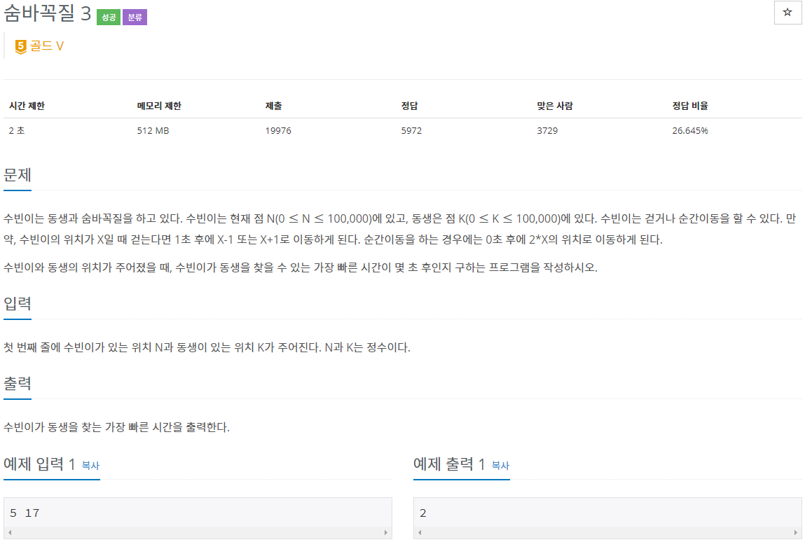 수빈이는 동생과 숨바꼭질을 하고 있다. 수빈이는 현재 점 N(0 ≤ N ≤ 100,000)에 있고, 동생은 점 K(0 ≤ K ≤ 100,000)에 있다. 수빈이는 걷거나 순간이동을 할 수 있다. 만약, 수빈이의 위치가 X일